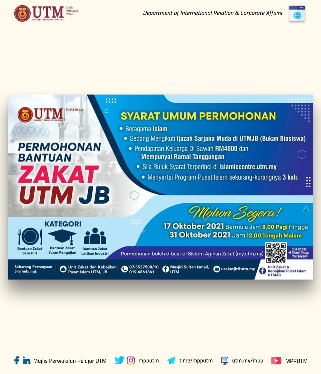 Majlis Perwakilan Pelajar Utm On Twitter Hebahan Tarikh Permohonan Bantuan Zakat Utm Jb Permohonan Bantuan Zakat Utm Jb Dibuka Hingga 31 10 2021 Oleh Itu Pelajar Perlu Merujuk Kepada Syarat Syarat Yang Telah Ditetapkan